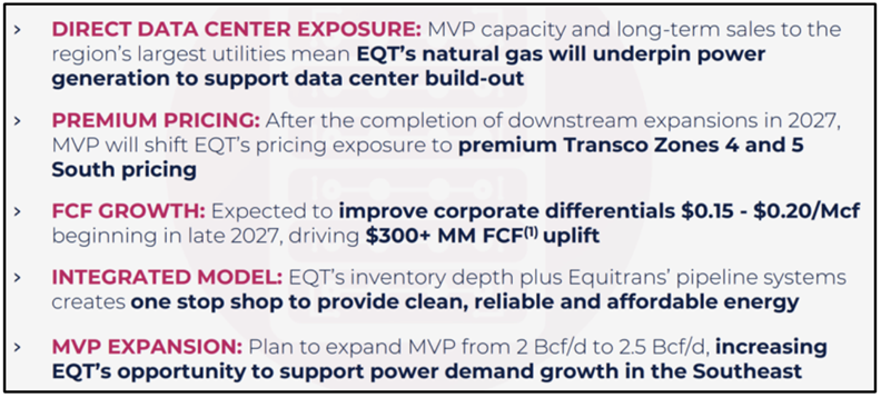 Expansion of MVP capacity. Currently, MVP can transport up to 2 Bcf/d of natural gas. EQT has about 1.2Bcf/d (60%) of capacity on the pipeline. At a relatively low cost, compression can add about 0.5 Bcf/d of capacity to MVP. However, additional natural gas transportation requires that Transco, (owned by the Williams Company) complete its Southeast Supply Expansion project. The Transco project is not expected to be in service until year end 2027.